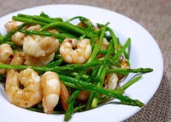 Asparagus and Prawn Stir Fry is a lovely healthy recipe for those who love food but are in a rush. Served as both a side dish and main dish, this recipe provides flavour, texture and amazing colours. A simple recipe of asparagus, prawns, garlic, chilli and ginger making a superb combination.