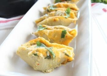Creamy Stuffed Pasta Shells is a quick efficient recipe to get hot food on a plate within 15 minutes. It may not be Michelin Star but it tastes good and ideal for those on the go. Served as a main course it makes good use of leftover chicken/turkey. A conchiglioni is a large version of the sea shell pasta. Its ideal for this recipe