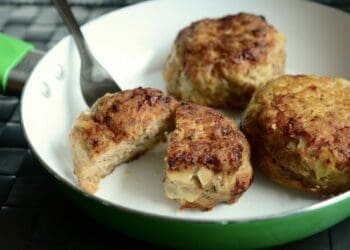 - Heat the oil/butter in a large pan over a medium heat and fry the patties for about 4 minutes each side or until golden brown and thoroughly cooked.1 knob butter