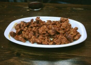 - Drain the beef and combine with the remaining ingredients except the almonds in a slow cooker.1 cup raisins, 1 tbsp chili powder, 1/2 tsp ground cinnamon, 1/2 tsp ground cumin, 3 cloves garlic, 2 medium apples, 15 oz tomatoes