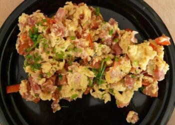 This is a meal that I love. Scrambled Eggs with Vegetables for brunch sets you up for the whole day. I often make this on a Sunday using any left over potatoes from the previous day. You can actually use other cooked vegetables and peas and green beans also work so well. I have also served this as a main dish with a simple side salad and it has worked very well. This is a simple dish that is always popular and even the children enjoy. I always chop up some fresh chives to serve as a garnish. They add mildly oniony but add a lovely subtle flavour.