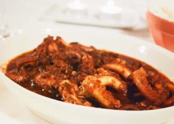 Spanish Octopus in Spicy Sauce also known as Pulpo en Salsa Picante is a lovely recipe for seafood lovers. The octopus is slowly boiled which not only cooks it but the liquid creates the base for the stunning sauce. This Spanish recipe makes maximum use of simple ingredients many of which, except the octopus, will be in your larder. The colour is from the paprika and red chilli flakes, both of which add a lovely warmth to the dish.